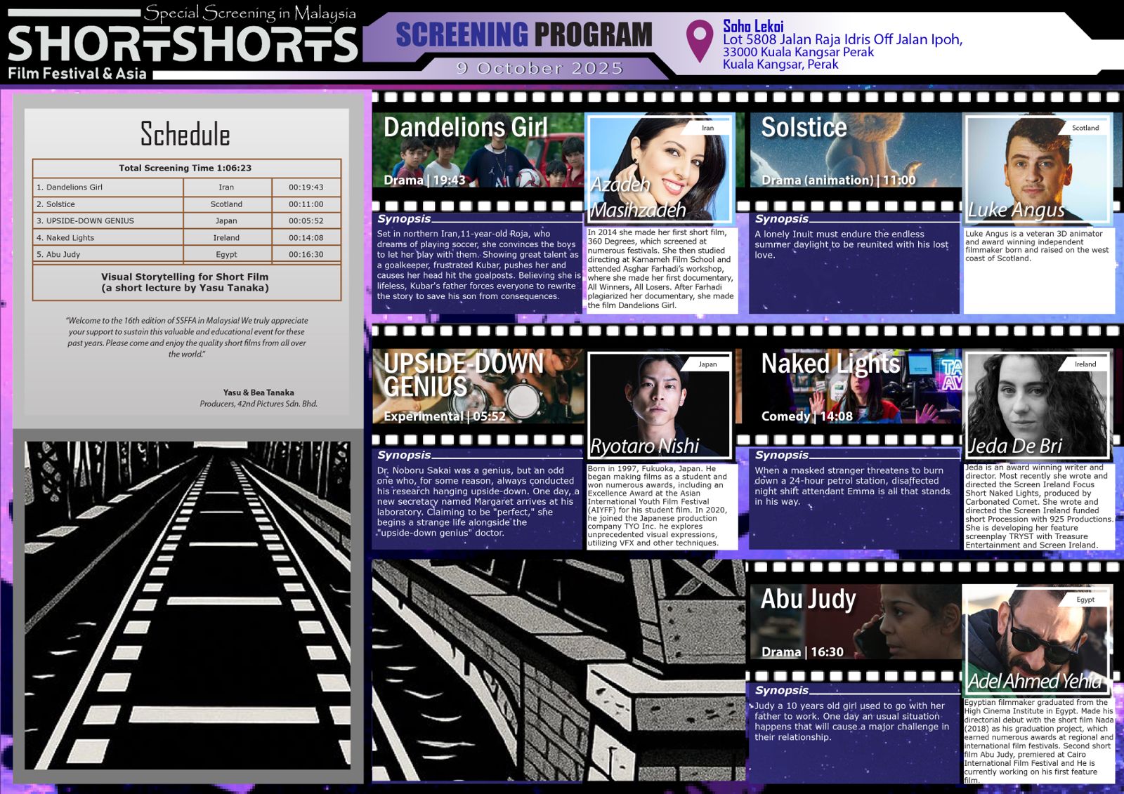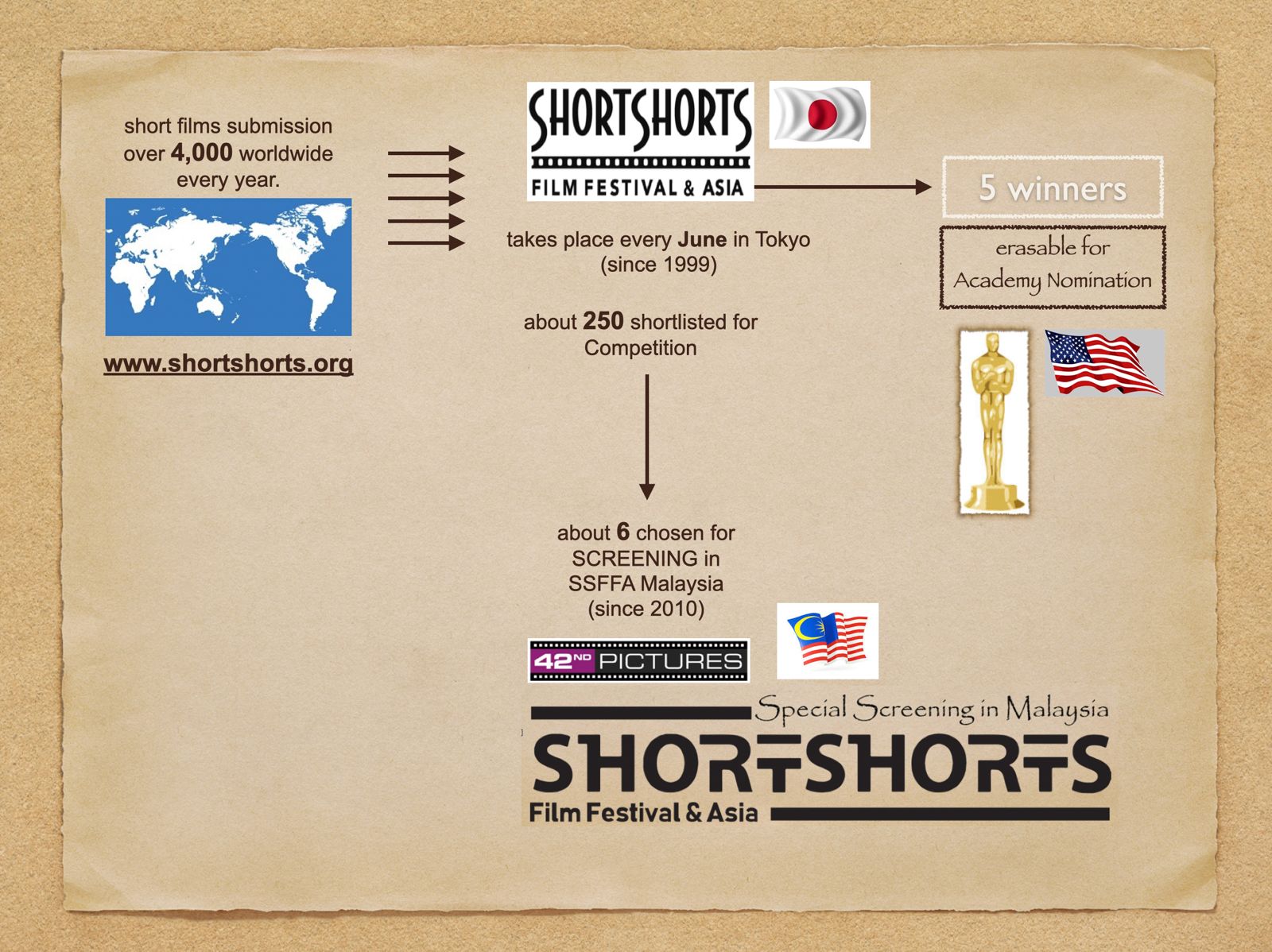 SSFFA JAPAN  takes place in June every year in Japan and we would like to share this experience in Malaysia. We screen selected award winning and quality short films under the regulation of its mother festival.
